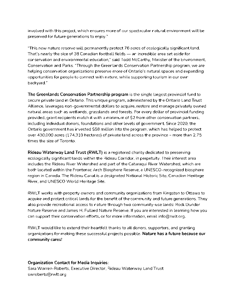 Press Releases In the News Lealand Press Release (July 2025) Long Island Press Release (June 2025) Subscribe to our FREE monthly digital newsletter and be the first to hear about these projects! Subscribe Nature has a future because our community cares Donate Connect with us on social media! Facebook Instagram Facebook Instagram P.O. Box 42, Elgin, Ontario, K0G 1E0 Canada